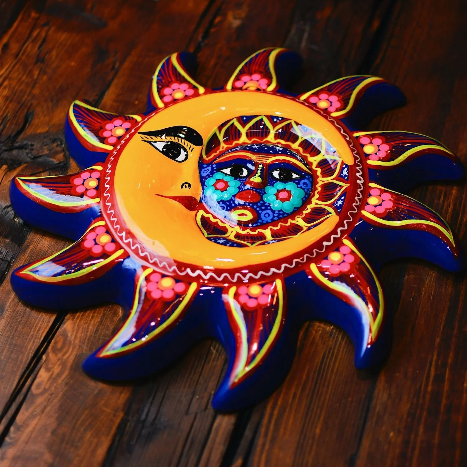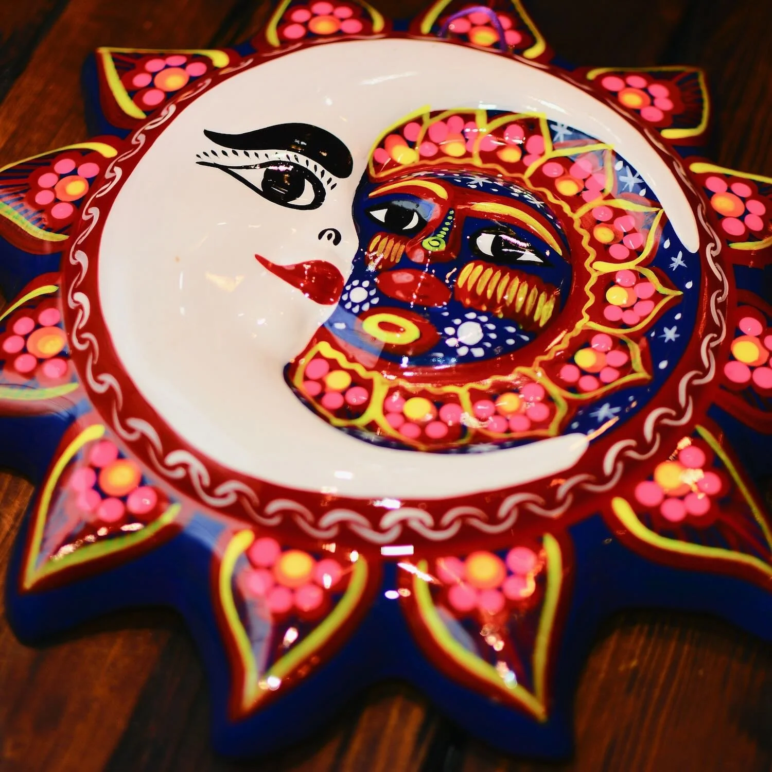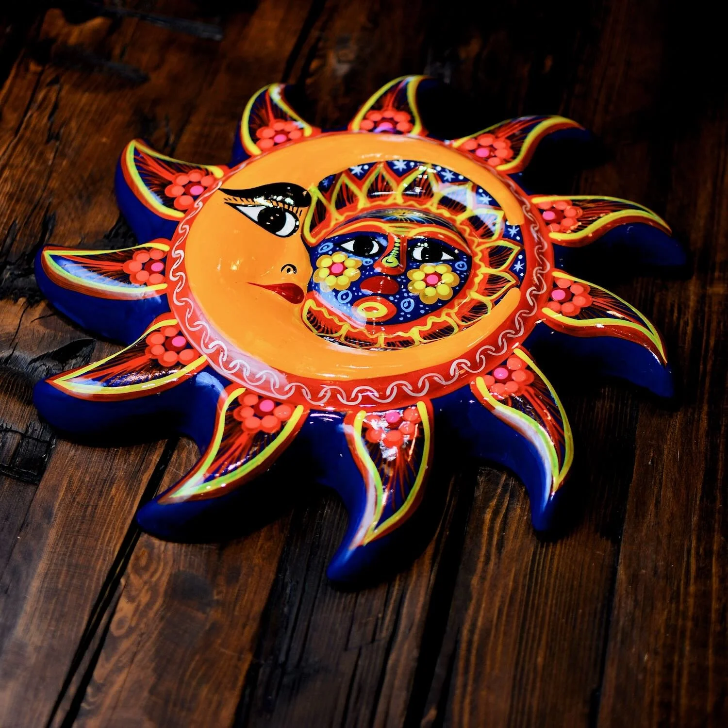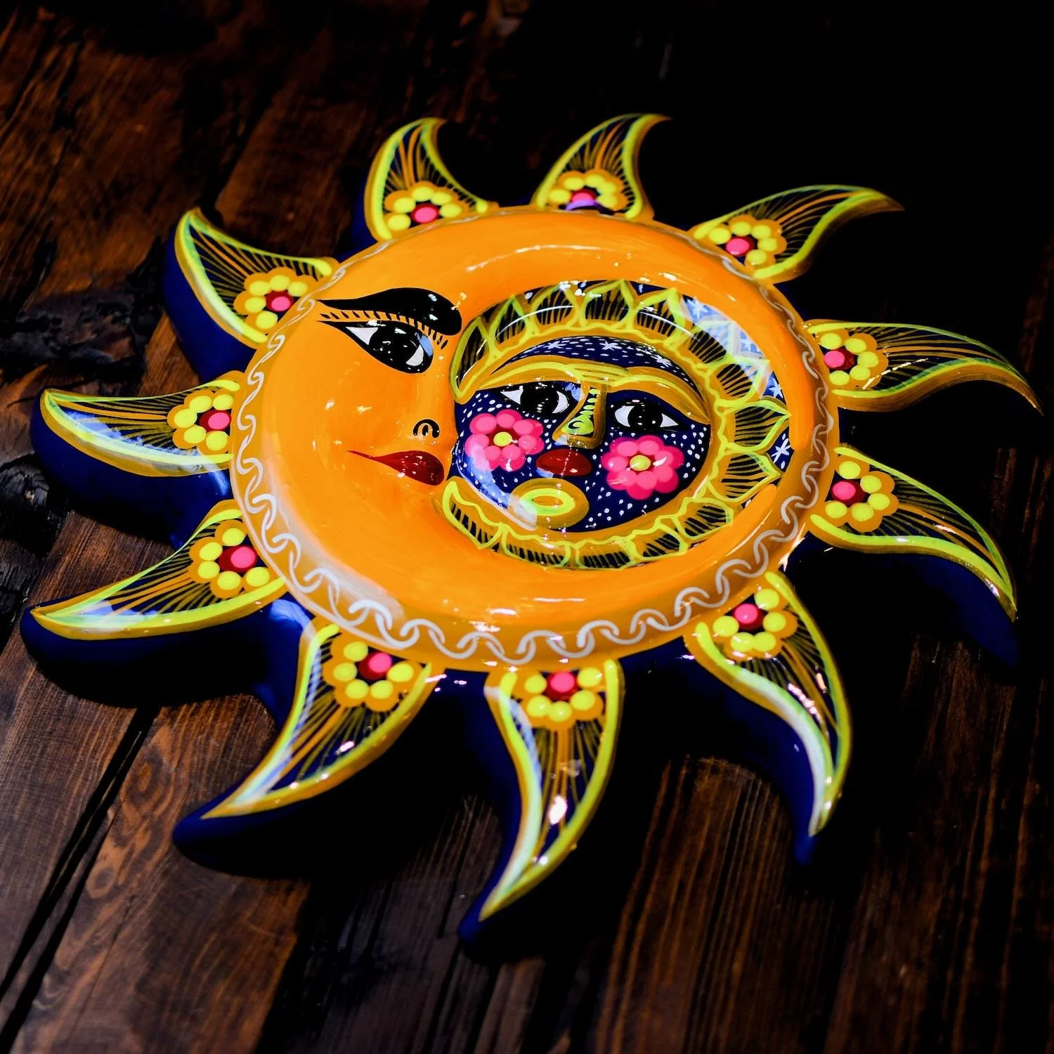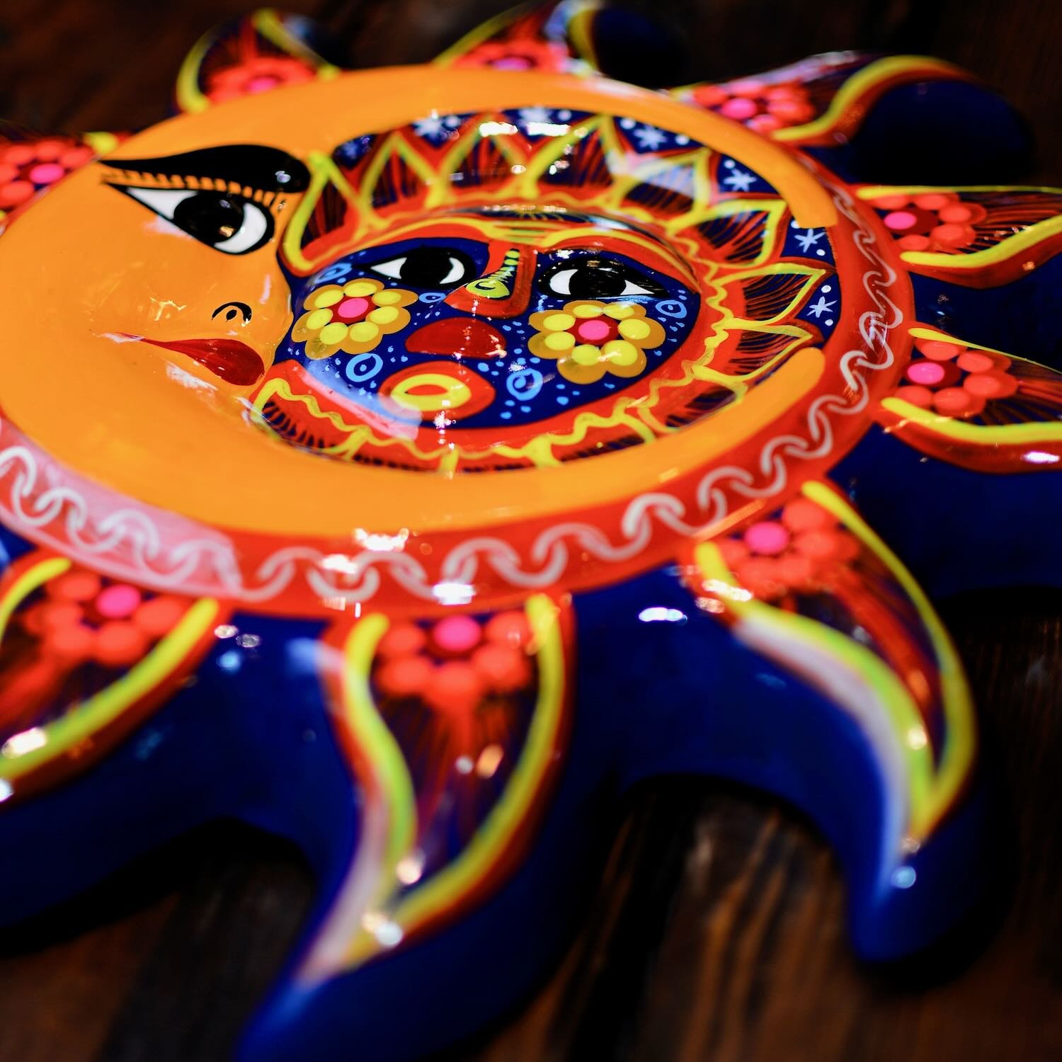 Returns & Exchanges | Shipping Categories: Select a Category Dining Bars Bar Tables Benches Booths Buffets Cabinets Chairs Curios Islands Stools Dining Tables Living Armoires Benches Chairs Coffee Tables Console & Sofa Tables End Tables Hall Trees Ottomans Saddle Stands Sofas Office Bookcases Desks Desk Chair Furniture Bed & Bath Beds Chests Dressers Nightstands Vanities Decor Animals Birds Cats Dogs Candles & Incense Candle Holders & Stands Burners Luminarias Chimineas Cowhide & Leather Bowls Coasters Cowhides Cow Skulls Miscellaneous Runners Dia de los Muertos Doors Glassware Bottles Glasses Glassware Sets Pitchers Shot Glasses Holiday Christmas Halloween Other Outdoor Grills Metal Art Planters, Jars & Vases Religious Angels Crosses Retablos Sacred Hearts Serveware Barware Bowls Canisters & Jars Cups Display Plates Miscellaneous Plates Spoons Tea & Coffee Pots Tortilla Warmers Sinks Table Decor Boxes Picture Frames Table Decor Textiles Amate Aprons Baskets Blankets Coasters Cornhusk Palm Decor Pillows Table Runners Wall Decor Clay Copper Glass Metal Suns, Moons & Stars Talavera Western Art & Mirrors Carved Mirrors Paintings Photography Sculptures Lighting Table Lamps Floor Lamps Lampshades Pigskin Rawhide Specialty Lighting Apparel Purses & Bags Decor / Wall Decor / Suns, Moons & Stars Sol y Luna de Talavera $60.00 Sol y Luna de Talavera $49.00 Talavera Sun & Moon with Stars $99.00 Sol Vibrante $199.00 Sol Y Luna $299.00 Cobalt Clay Sun Face $59.00 Arcilla Sol y Luna $49.00