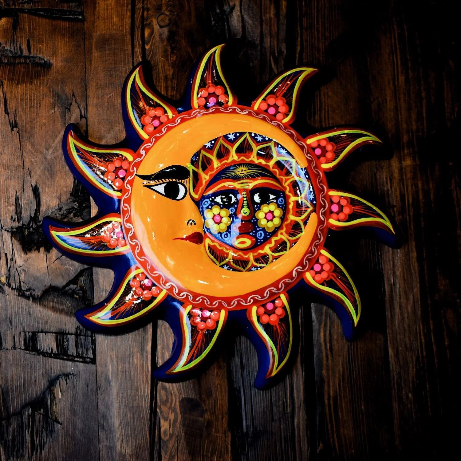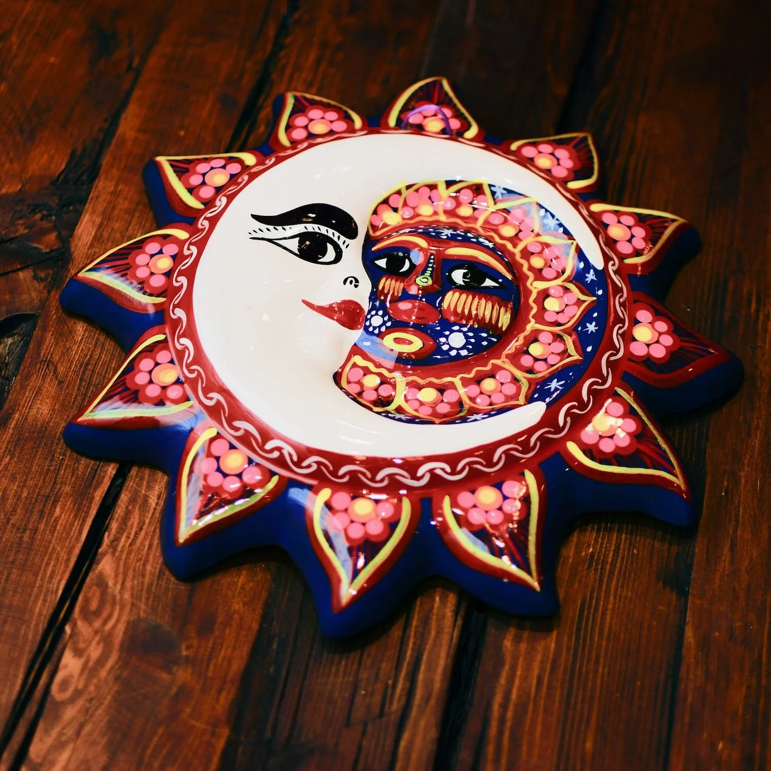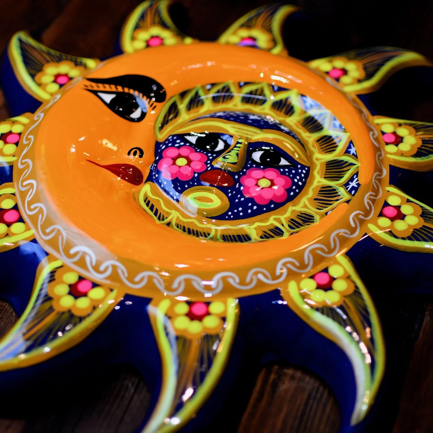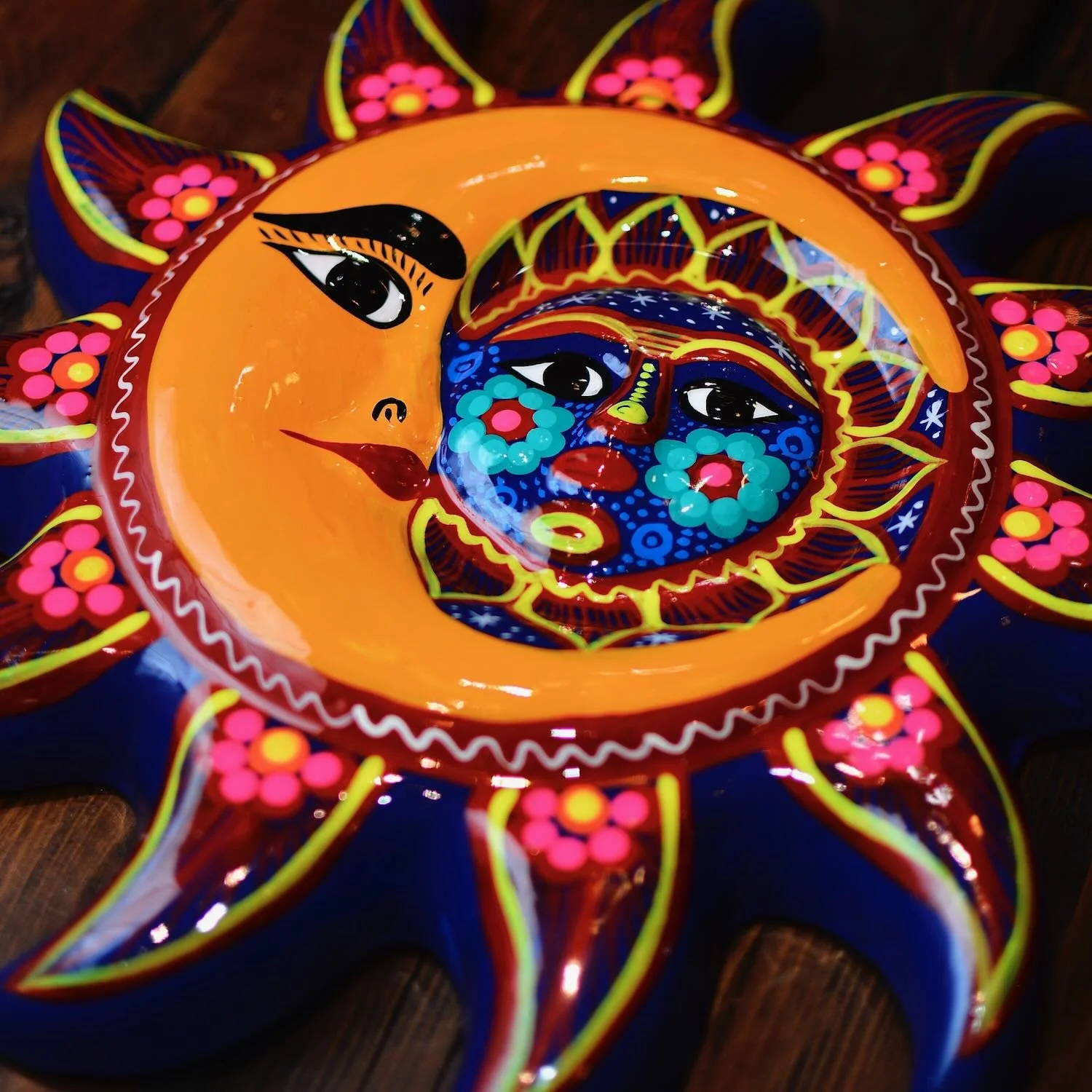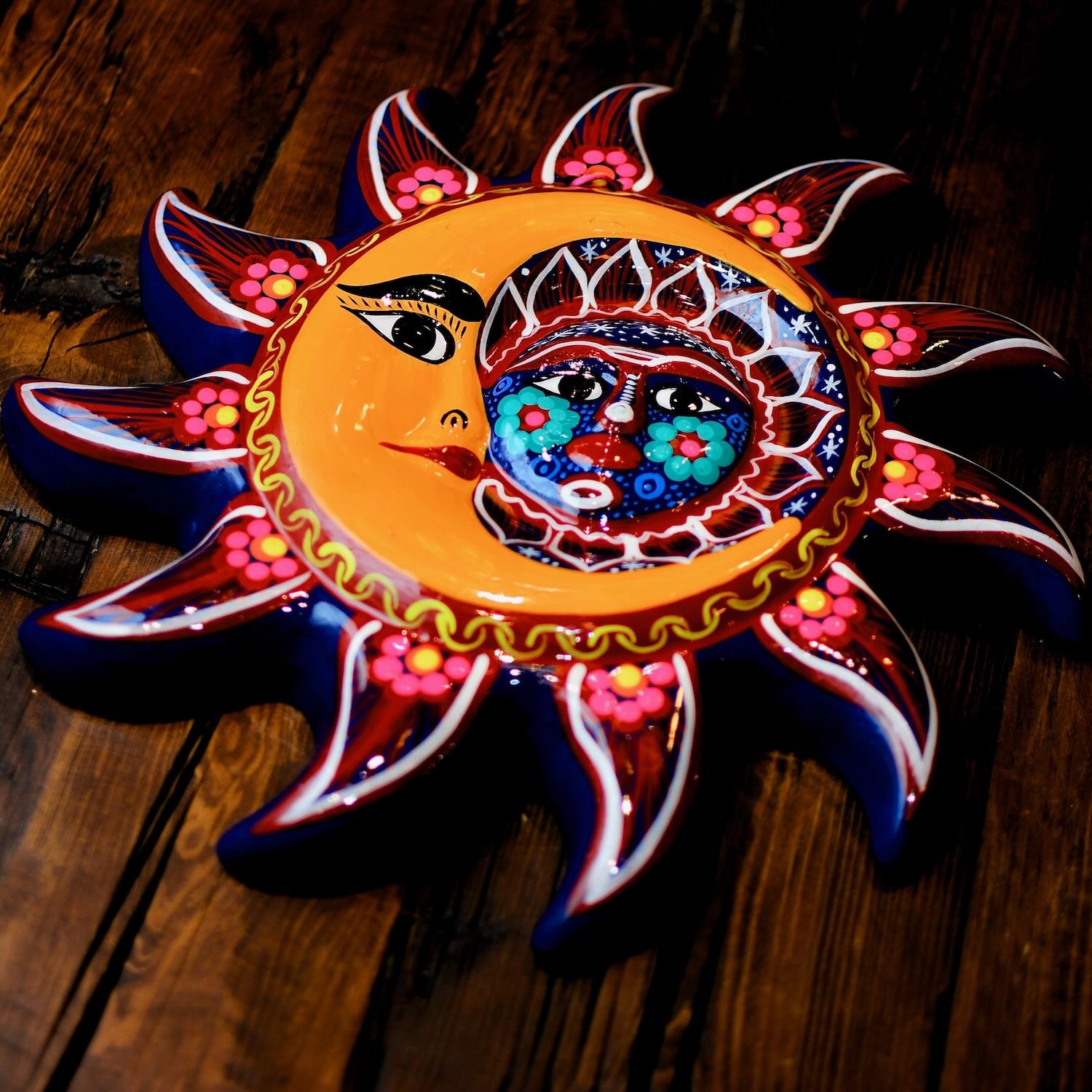 Returns & Exchanges | Shipping Categories: Select a Category Dining Bars Bar Tables Benches Booths Buffets Cabinets Chairs Curios Islands Stools Dining Tables Living Armoires Benches Chairs Coffee Tables Console & Sofa Tables End Tables Hall Trees Ottomans Saddle Stands Sofas Office Bookcases Desks Desk Chair Furniture Bed & Bath Beds Chests Dressers Nightstands Vanities Decor Animals Birds Cats Dogs Candles & Incense Candle Holders & Stands Burners Luminarias Chimineas Cowhide & Leather Bowls Coasters Cowhides Cow Skulls Miscellaneous Runners Dia de los Muertos Doors Glassware Bottles Glasses Glassware Sets Pitchers Shot Glasses Holiday Christmas Halloween Other Outdoor Grills Metal Art Planters, Jars & Vases Religious Angels Crosses Retablos Sacred Hearts Serveware Barware Bowls Canisters & Jars Cups Display Plates Miscellaneous Plates Spoons Tea & Coffee Pots Tortilla Warmers Sinks Table Decor Boxes Picture Frames Table Decor Textiles Amate Aprons Baskets Blankets Coasters Cornhusk Palm Decor Pillows Table Runners Wall Decor Clay Copper Glass Metal Suns, Moons & Stars Talavera Western Art & Mirrors Carved Mirrors Paintings Photography Sculptures Lighting Table Lamps Floor Lamps Lampshades Pigskin Rawhide Specialty Lighting Apparel Purses & Bags Decor / Wall Decor / Suns, Moons & Stars Sol y Luna de Talavera $60.00 Sol y Luna de Talavera $49.00 Talavera Sun & Moon with Stars $99.00 Sol Vibrante $199.00 Sol Y Luna $299.00 Cobalt Clay Sun Face $59.00 Arcilla Sol y Luna $49.00