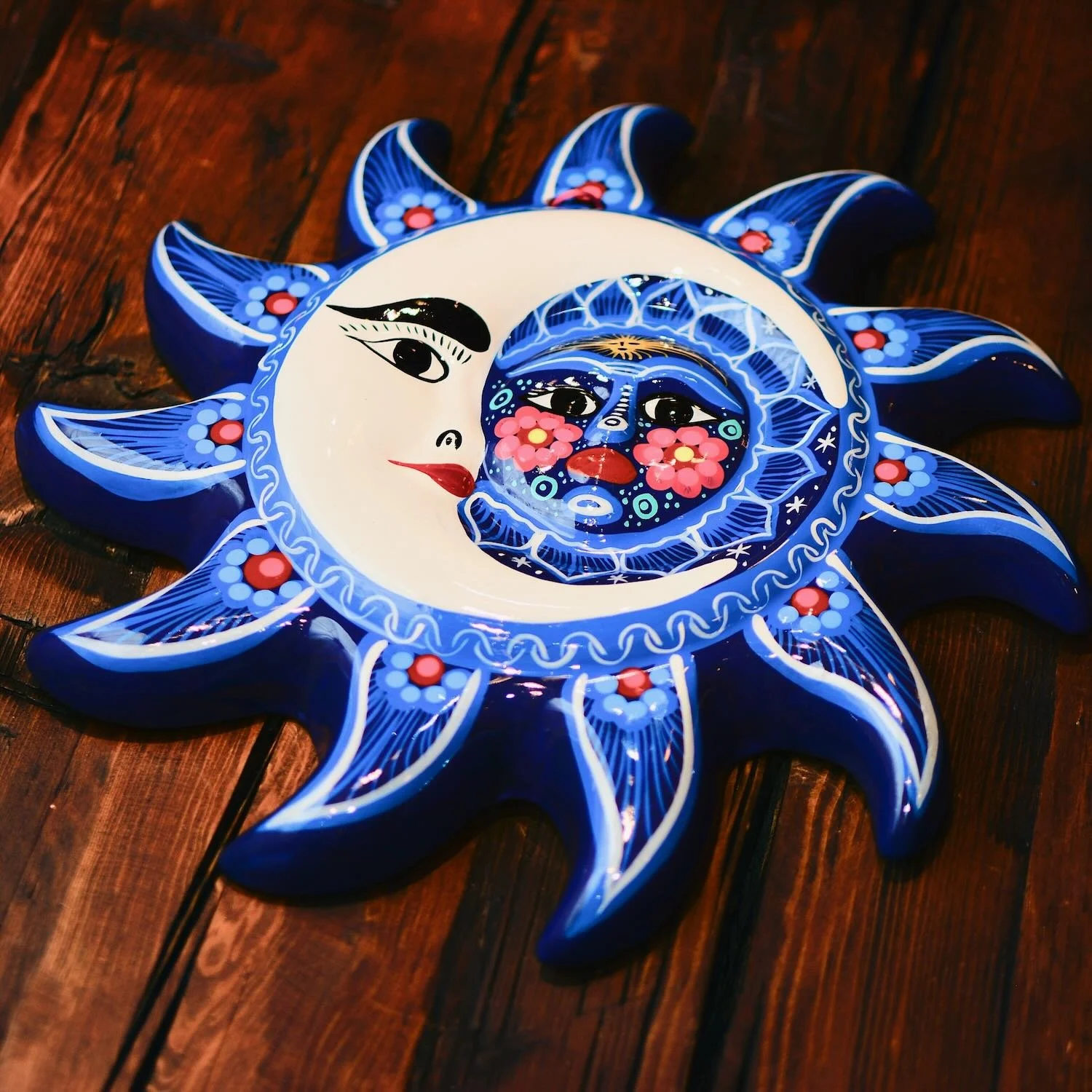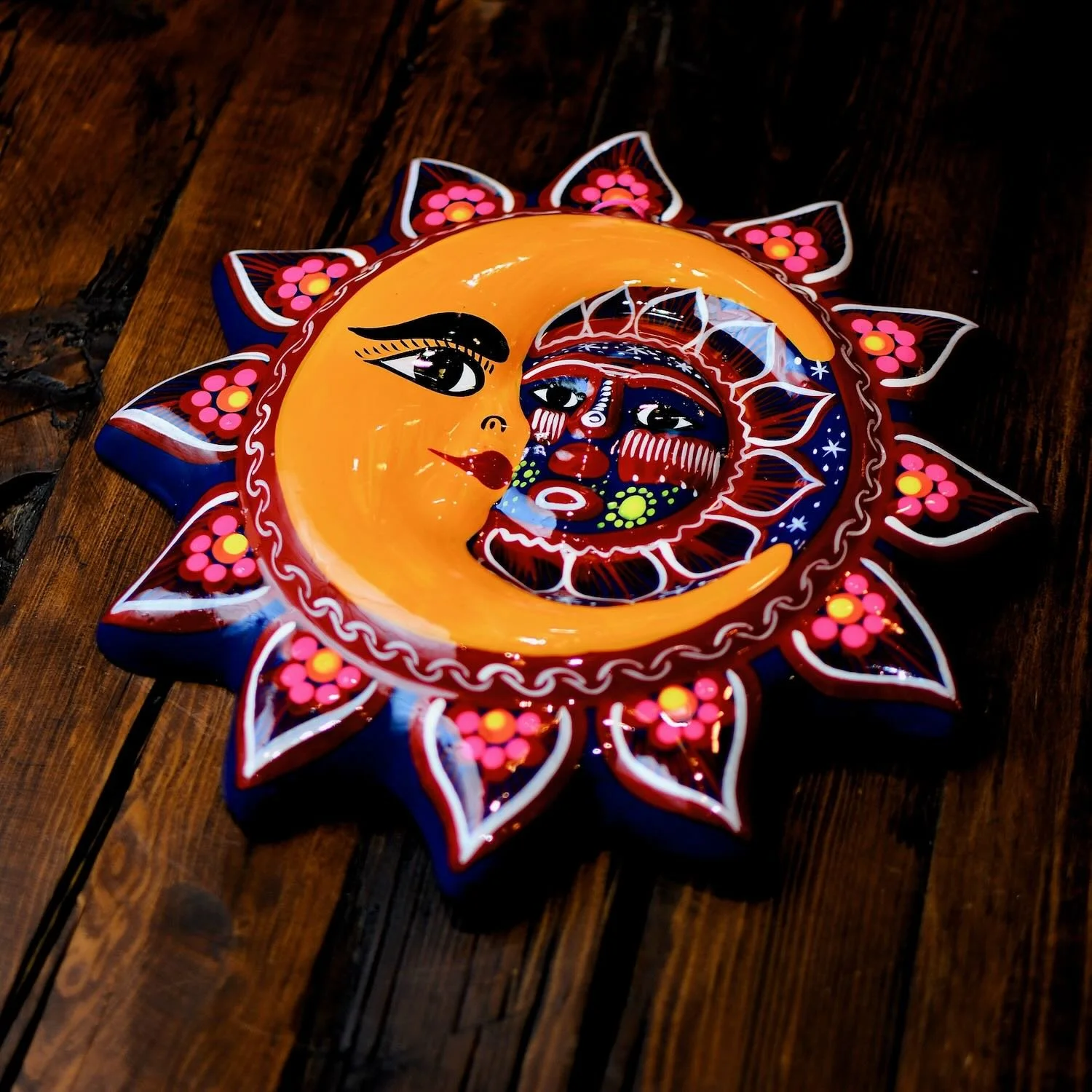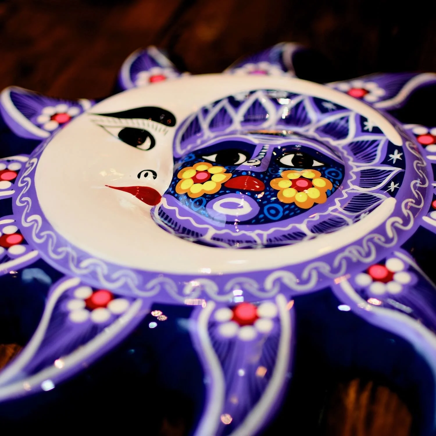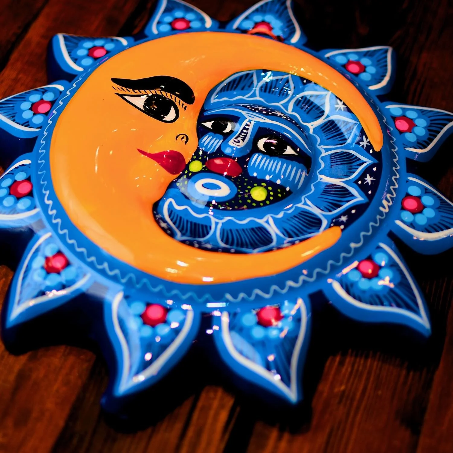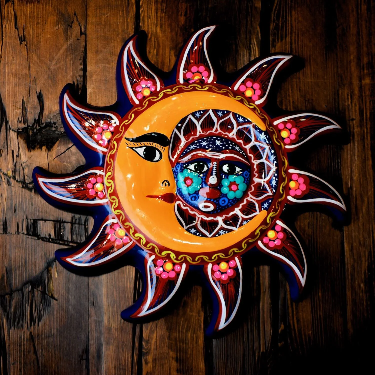 Returns & Exchanges | Shipping Categories: Select a Category Dining Bars Bar Tables Benches Booths Buffets Cabinets Chairs Curios Islands Stools Dining Tables Living Armoires Benches Chairs Coffee Tables Console & Sofa Tables End Tables Hall Trees Ottomans Saddle Stands Sofas Office Bookcases Desks Desk Chair Furniture Bed & Bath Beds Chests Dressers Nightstands Vanities Decor Animals Birds Cats Dogs Candles & Incense Candle Holders & Stands Burners Luminarias Chimineas Cowhide & Leather Bowls Coasters Cowhides Cow Skulls Miscellaneous Runners Dia de los Muertos Doors Glassware Bottles Glasses Glassware Sets Pitchers Shot Glasses Holiday Christmas Halloween Other Outdoor Grills Metal Art Planters, Jars & Vases Religious Angels Crosses Retablos Sacred Hearts Serveware Barware Bowls Canisters & Jars Cups Display Plates Miscellaneous Plates Spoons Tea & Coffee Pots Tortilla Warmers Sinks Table Decor Boxes Picture Frames Table Decor Textiles Amate Aprons Baskets Blankets Coasters Cornhusk Palm Decor Pillows Table Runners Wall Decor Clay Copper Glass Metal Suns, Moons & Stars Talavera Western Art & Mirrors Carved Mirrors Paintings Photography Sculptures Lighting Table Lamps Floor Lamps Lampshades Pigskin Rawhide Specialty Lighting Apparel Purses & Bags Decor / Wall Decor / Suns, Moons & Stars Sol y Luna de Talavera $60.00 Sol y Luna de Talavera $49.00 Talavera Sun & Moon with Stars $99.00 Sol Vibrante $199.00 Sol Y Luna $299.00 Cobalt Clay Sun Face $59.00 Arcilla Sol y Luna $49.00