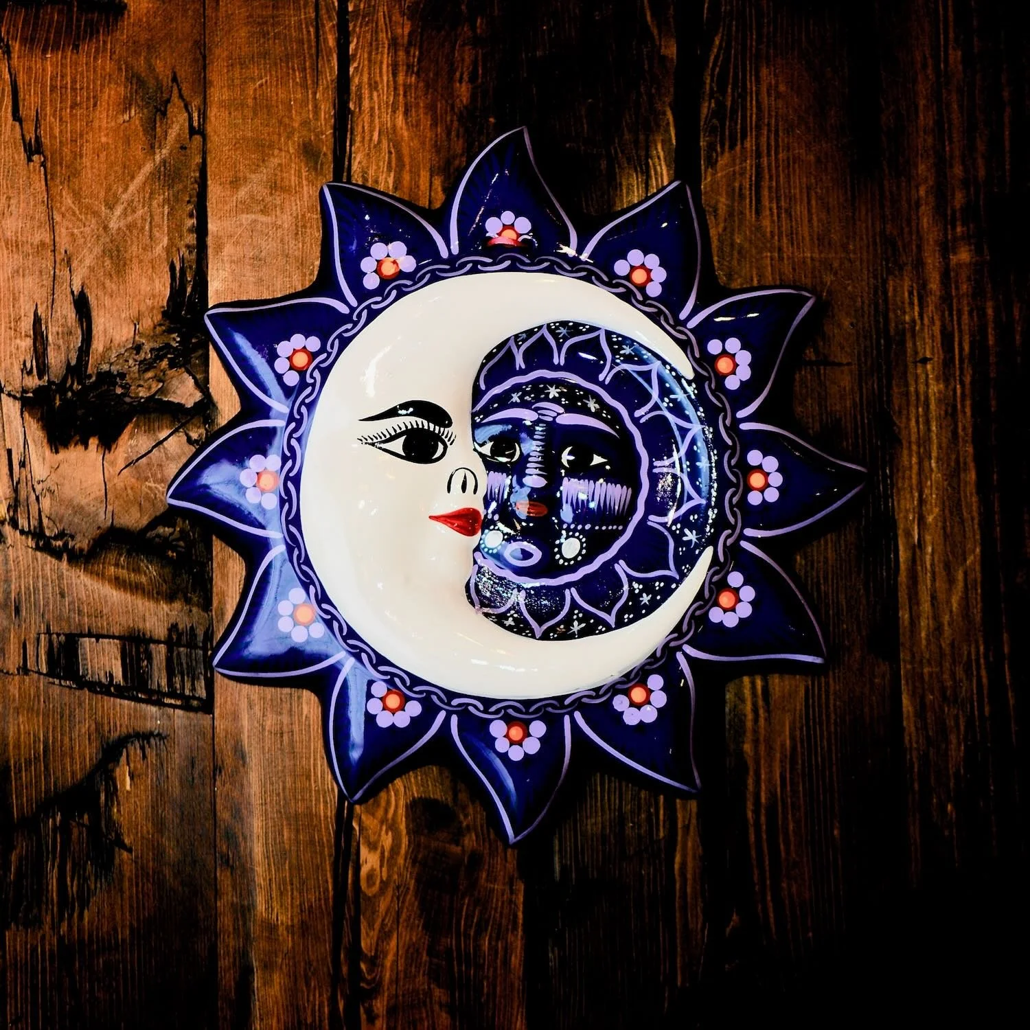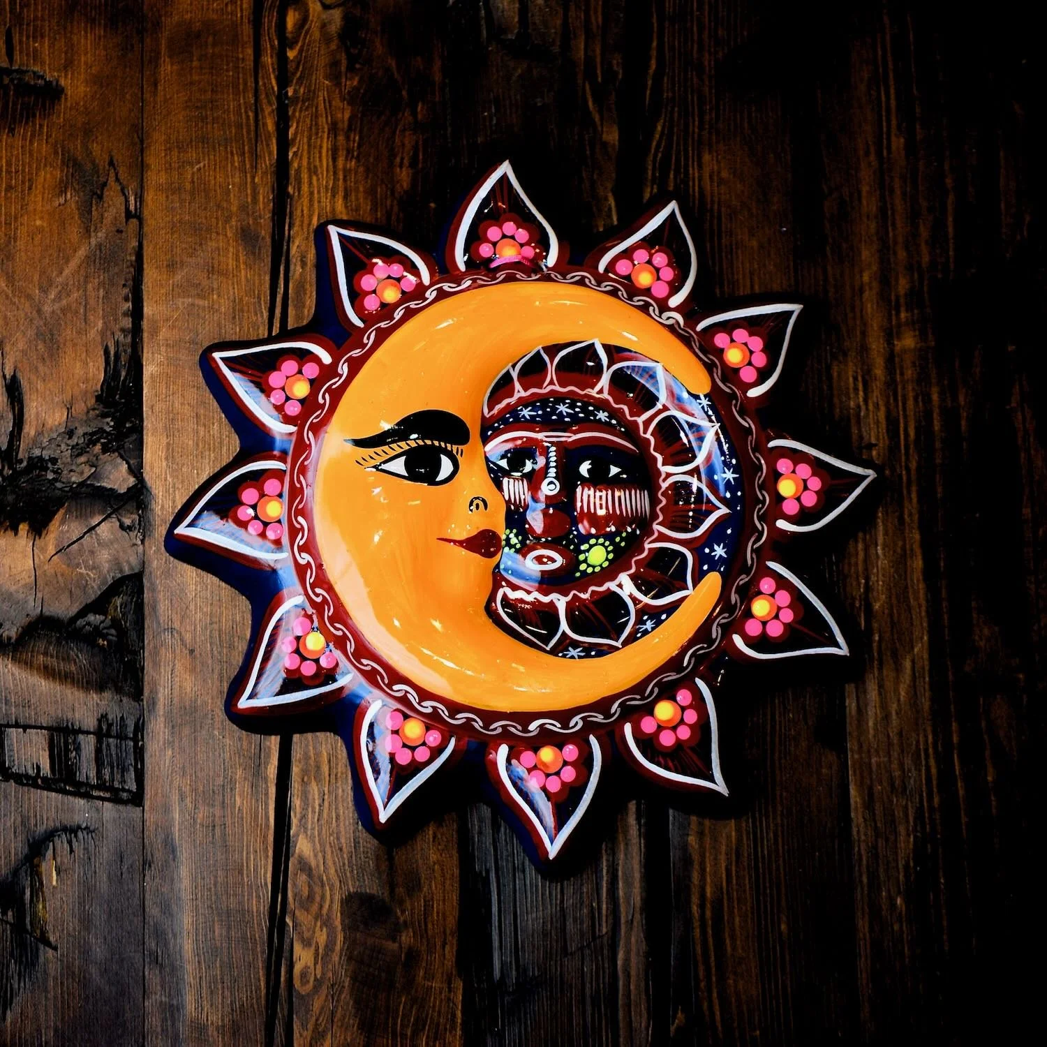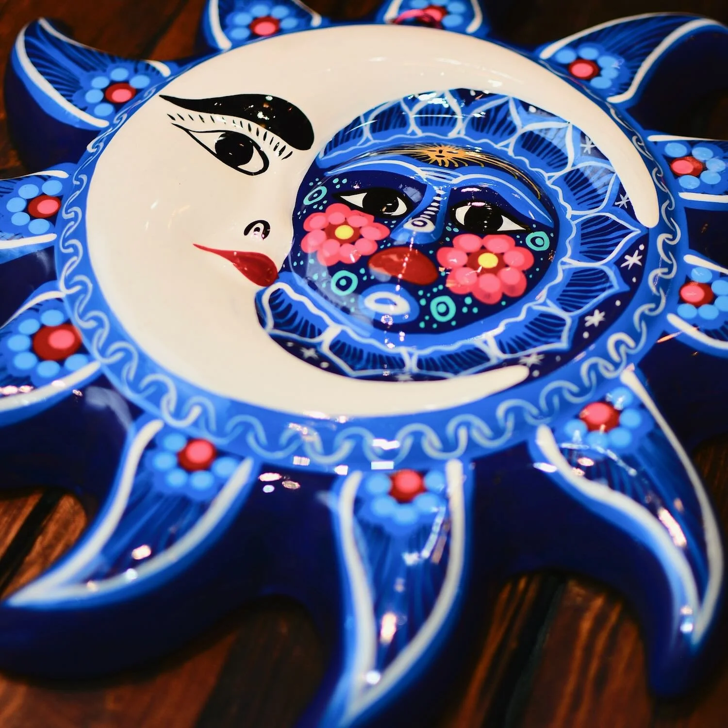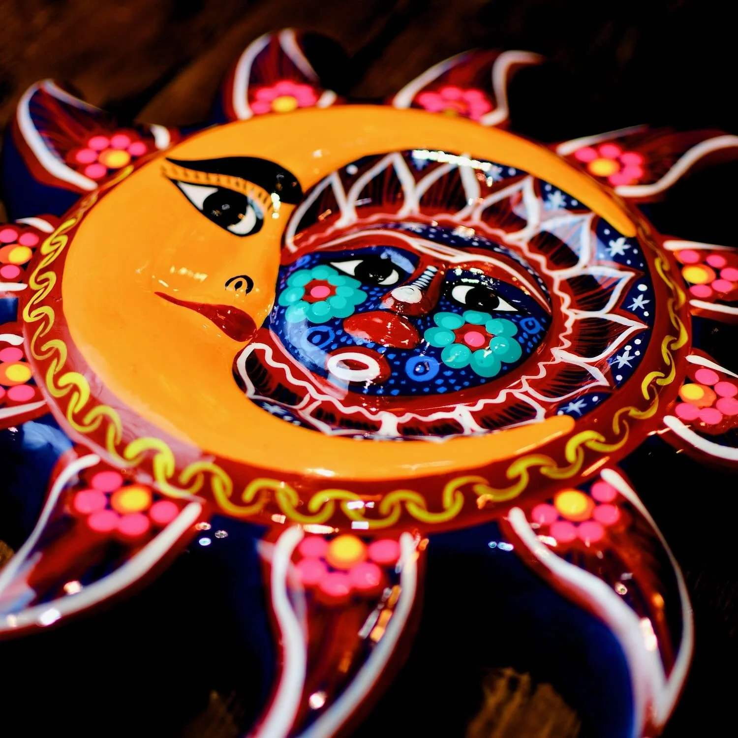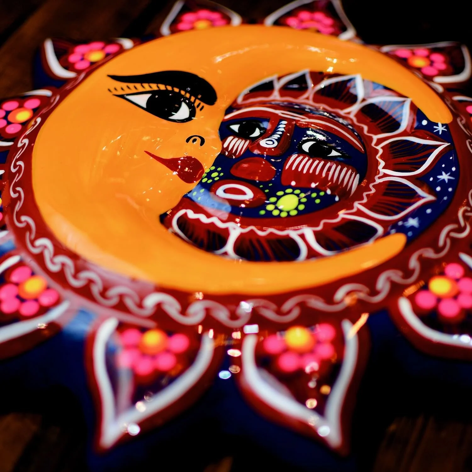 Returns & Exchanges | Shipping Categories: Select a Category Dining Bars Bar Tables Benches Booths Buffets Cabinets Chairs Curios Islands Stools Dining Tables Living Armoires Benches Chairs Coffee Tables Console & Sofa Tables End Tables Hall Trees Ottomans Saddle Stands Sofas Office Bookcases Desks Desk Chair Furniture Bed & Bath Beds Chests Dressers Nightstands Vanities Decor Animals Birds Cats Dogs Candles & Incense Candle Holders & Stands Burners Luminarias Chimineas Cowhide & Leather Bowls Coasters Cowhides Cow Skulls Miscellaneous Runners Dia de los Muertos Doors Glassware Bottles Glasses Glassware Sets Pitchers Shot Glasses Holiday Christmas Halloween Other Outdoor Grills Metal Art Planters, Jars & Vases Religious Angels Crosses Retablos Sacred Hearts Serveware Barware Bowls Canisters & Jars Cups Display Plates Miscellaneous Plates Spoons Tea & Coffee Pots Tortilla Warmers Sinks Table Decor Boxes Picture Frames Table Decor Textiles Amate Aprons Baskets Blankets Coasters Cornhusk Palm Decor Pillows Table Runners Wall Decor Clay Copper Glass Metal Suns, Moons & Stars Talavera Western Art & Mirrors Carved Mirrors Paintings Photography Sculptures Lighting Table Lamps Floor Lamps Lampshades Pigskin Rawhide Specialty Lighting Apparel Purses & Bags Decor / Wall Decor / Suns, Moons & Stars Sol y Luna de Talavera $60.00 Sol y Luna de Talavera $49.00 Talavera Sun & Moon with Stars $99.00 Sol Vibrante $199.00 Sol Y Luna $299.00 Cobalt Clay Sun Face $59.00 Arcilla Sol y Luna $49.00