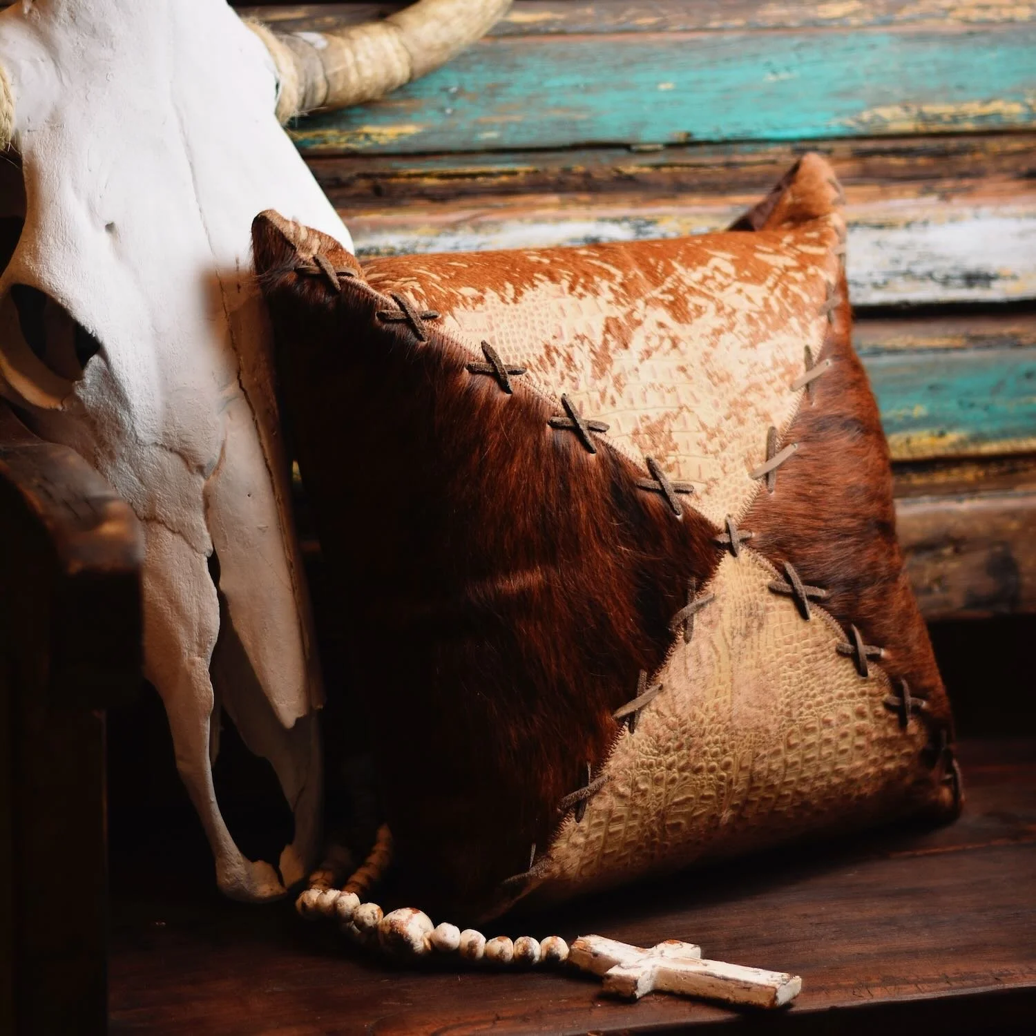 The Tombstone Pillow 009 from Milagros Rústicos is a bold handcrafted accent made in Brazil using premium Brazilian cowhide. Featuring rich brown cowhide paired with dramatic black cowhide strips highlighted by shimmering golden acid-washed accents, this one-of-a-kind pillow delivers striking Western style with refined edge.