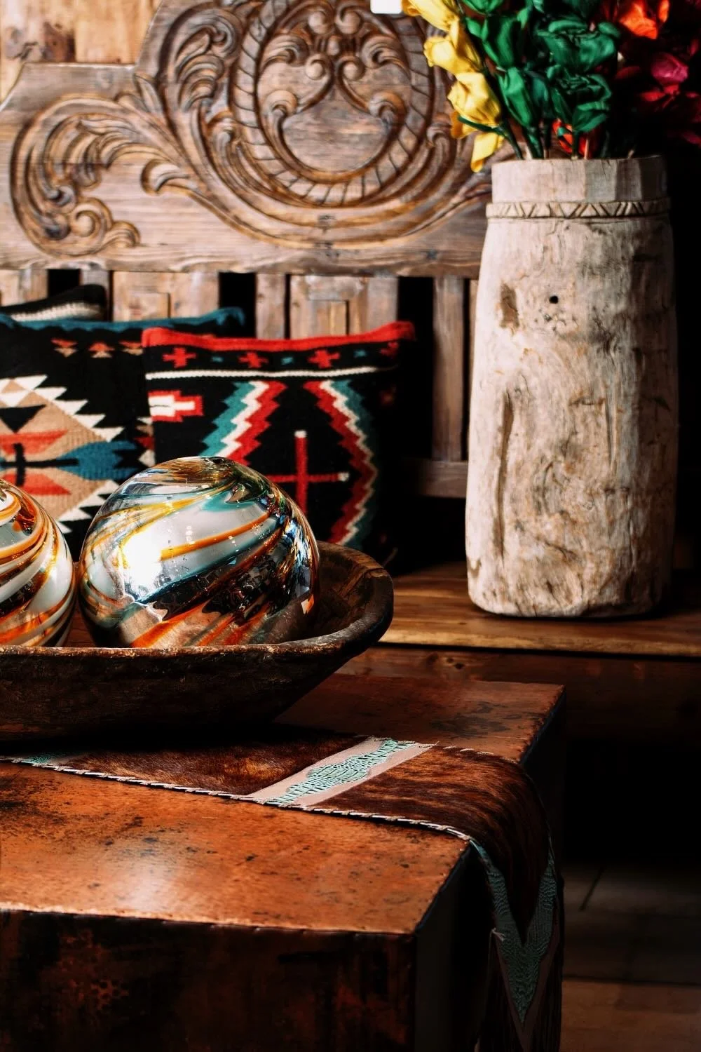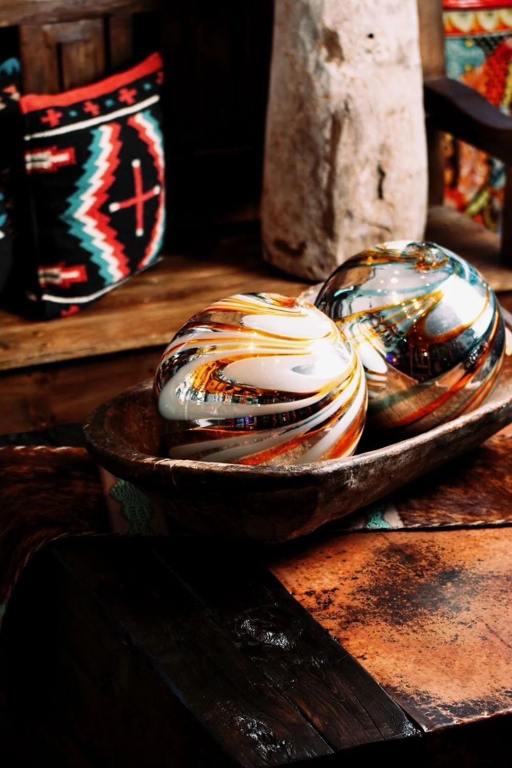 Resting atop the leather is a One-of-a-Kind Antique Wood Vessel filled with our 12" Handblown Swirled Glass Balls. The scale is intentional. In a luxury space, "small and cluttered" is the enemy; "large and bold" is the goal. These oversized spheres create a play of light and transparency that softens the solid wood beams beneath them.