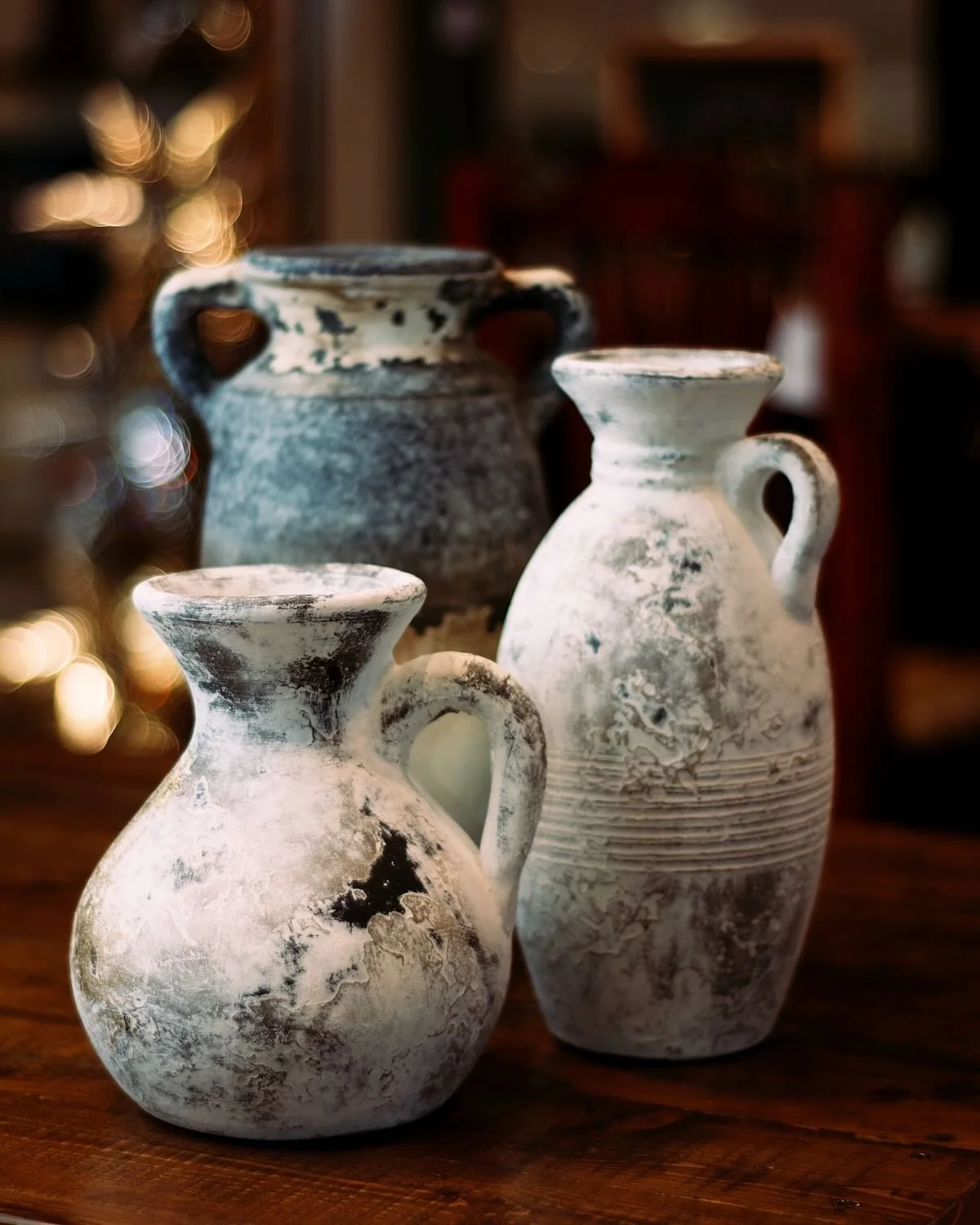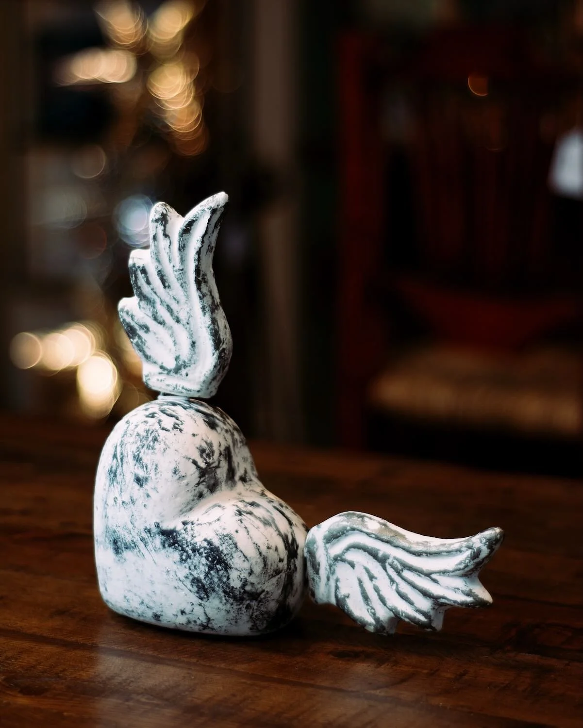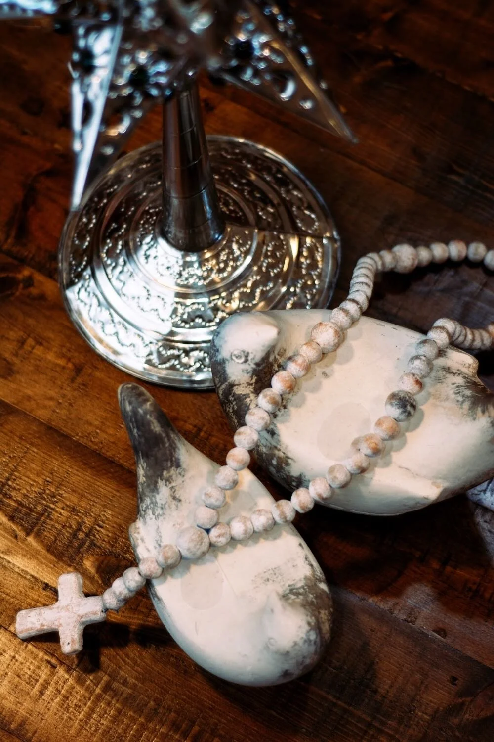 You’ll find white clay vases, hand-sculpted table doves, sacred hearts with wings, rosary beads, and candle holders, each lovingly handmade in Mexico. Every piece celebrates the artistry of simplicity — subtle textures, natural tones, and soulful craftsmanship.