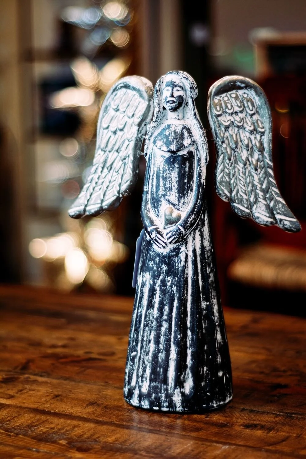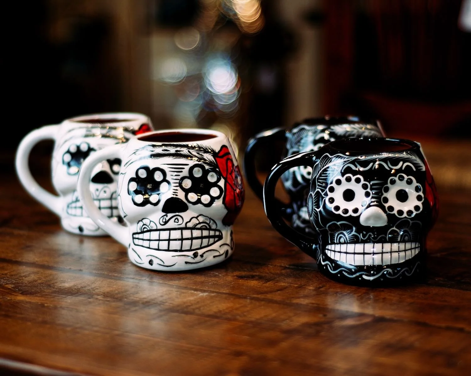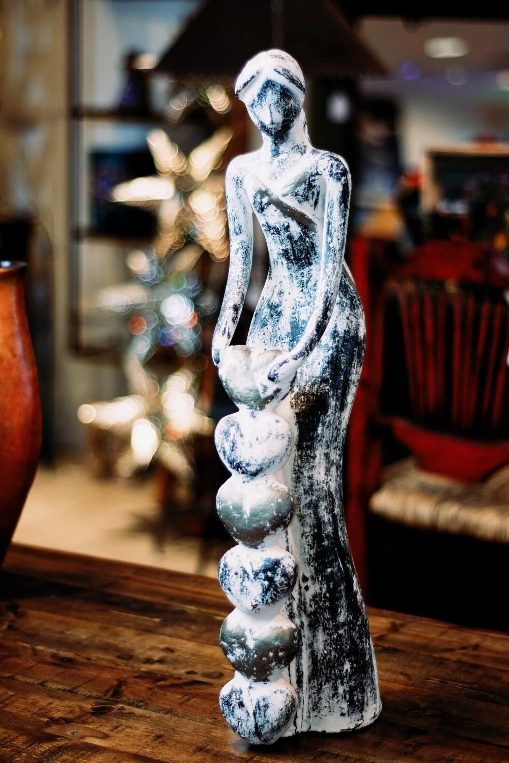 For a touch of contrast, we’ve added handblown black-and-white glassware, including a pitcher and tumbler set, plus black-and-white Catrina skull coffee mugs that are equal parts elegant and edgy. There’s also a white and blue Talavera cookie jar, a white and gray angel, and a lady holding a stack of hearts — each one a true work of folk art.