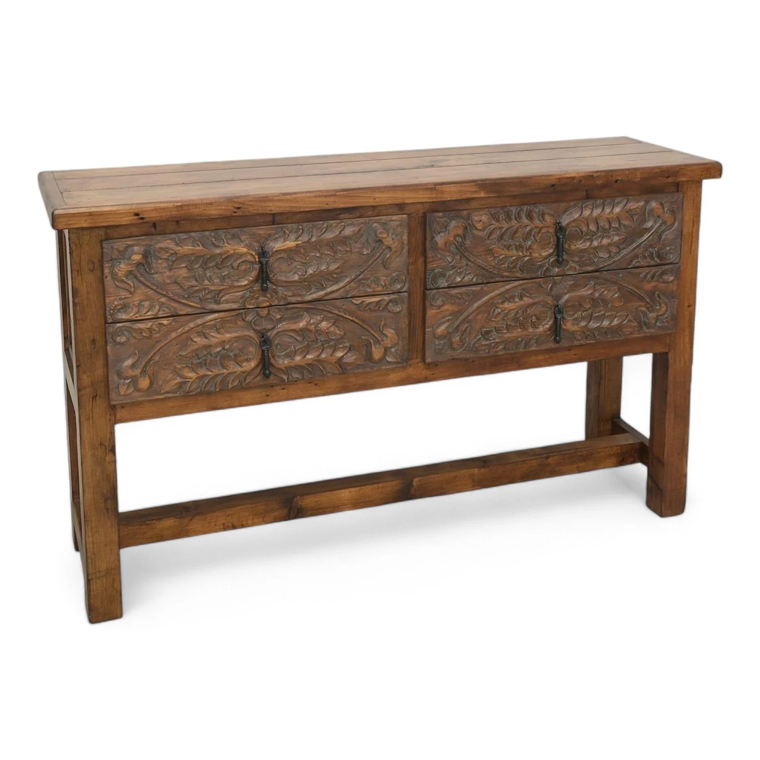 Experience the beauty of craftsmanship with the El Naranjo Cobre Entry Table, a stunning fusion of reclaimed wood and hand-pounded copper. Handmade in Mexico, this unique table is crafted from a solid reclaimed wood beam and joined together using traditional dovetail joints—without a single nail or screw. The natural copper wrapping on both legs adds warmth and character, perfectly complemented by the dark-stained finish. A true statement piece that embodies rustic elegance and timeless design.
